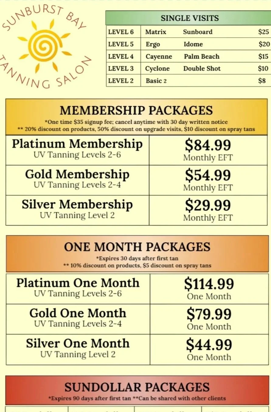 Sunburst bay has been serving the waterford community since 2001. Our mission is to provide you with the best quality tanning experience. Our warm and welcoming environment aims to keep customer satisfaction our number one priority. our personable and professional staff can help you choose the best beds and products to help you achieve and maintain the perfect tan. we look forward to adding you to our long history of happy and confident members!